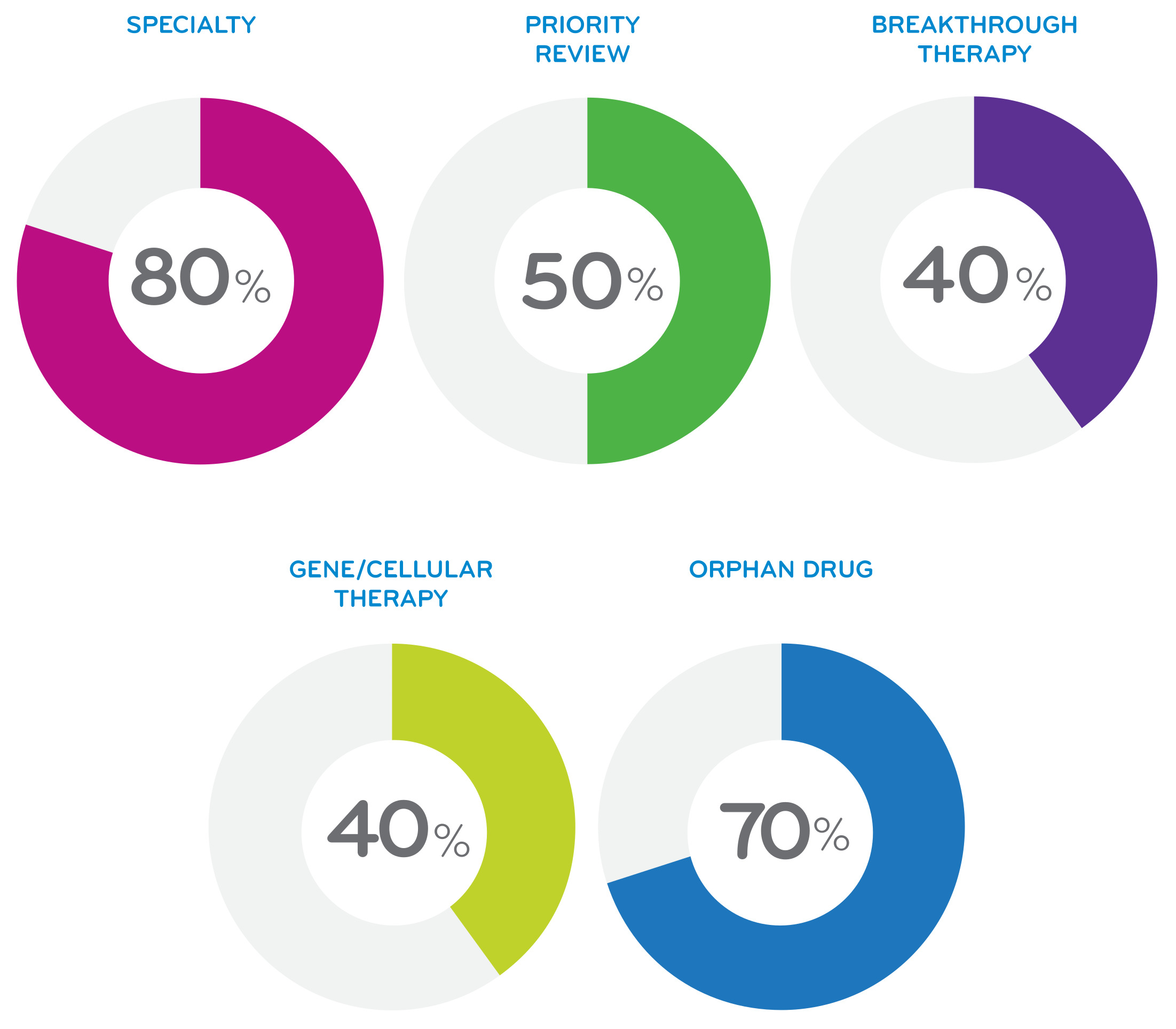 The FDA decisions for specialty medications (75%) and for Orphan Drugs (36%) continue to grow for agents with applications submitted to the FDA. One agent is seeking FDA’s Accelerated Approval.