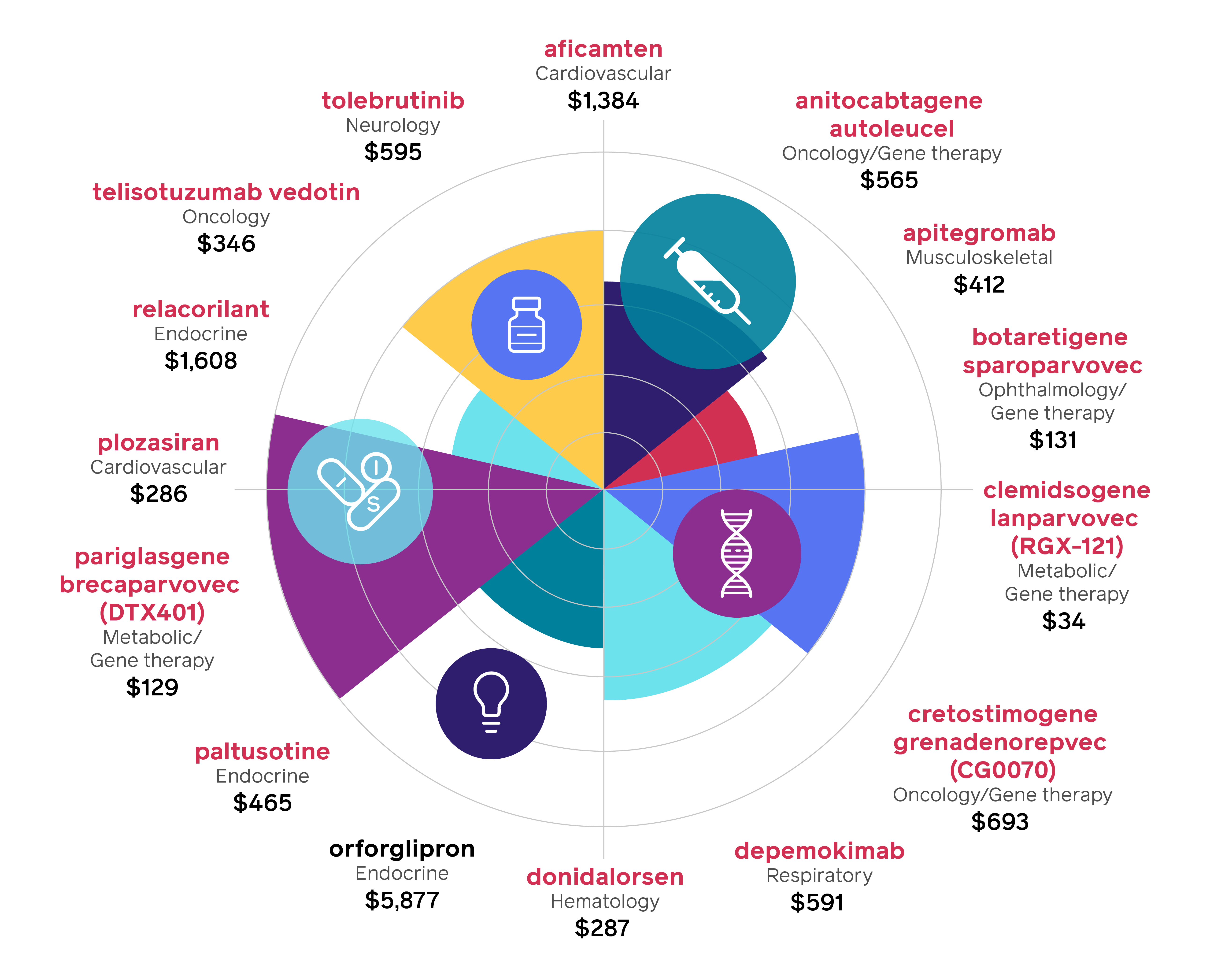 A market agnostic financial forecast primarily from Evaluate is included for select agents to assist payers with assessing the potential budgetary impact of the pipeline. Five-year projected annual U.S. sales are forecasted.