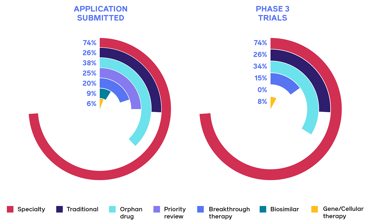 The FDA decisions for specialty medications (74%) and for orphan drugs (38%) continue to grow for agents with applications submitted to the FDA. Nine therapies are seeking FDA’s Accelerated Approval. FDA’s Accelerated Approval pathway allows for earlier approval of drugs to treat serious conditions, and fill an unmet medical need based on a surrogate endpoint. Confirmatory trials are needed to confirm clinical benefit for these drugs to remain on the market.