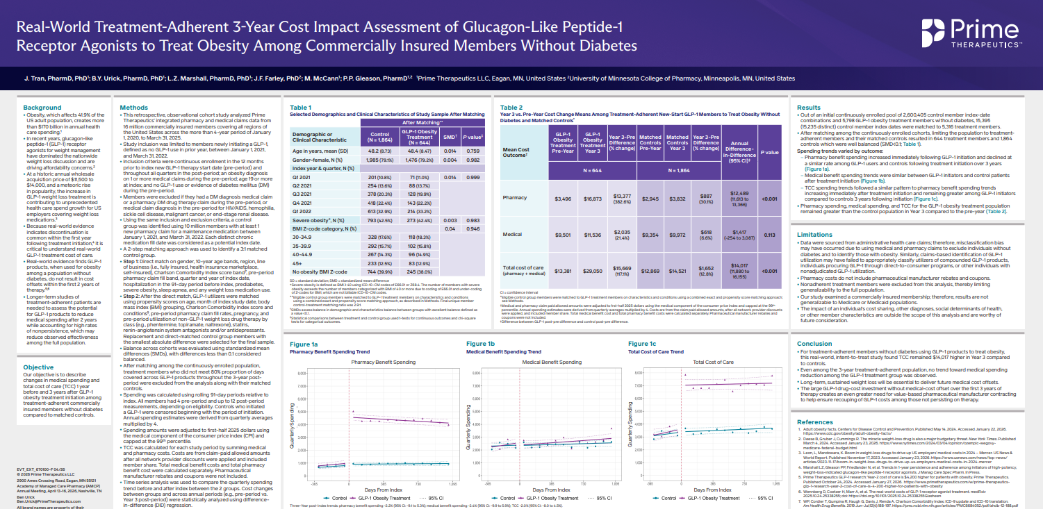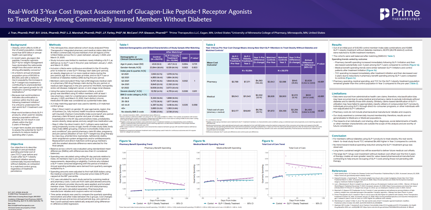 This study earned a gold award from AMCP. It examines how medical and overall health care costs changed over three years for people who stayed on glucagon-like peptide-1 (GLP‑1) receptor agonist medications for obesity when compared to a matched control group.