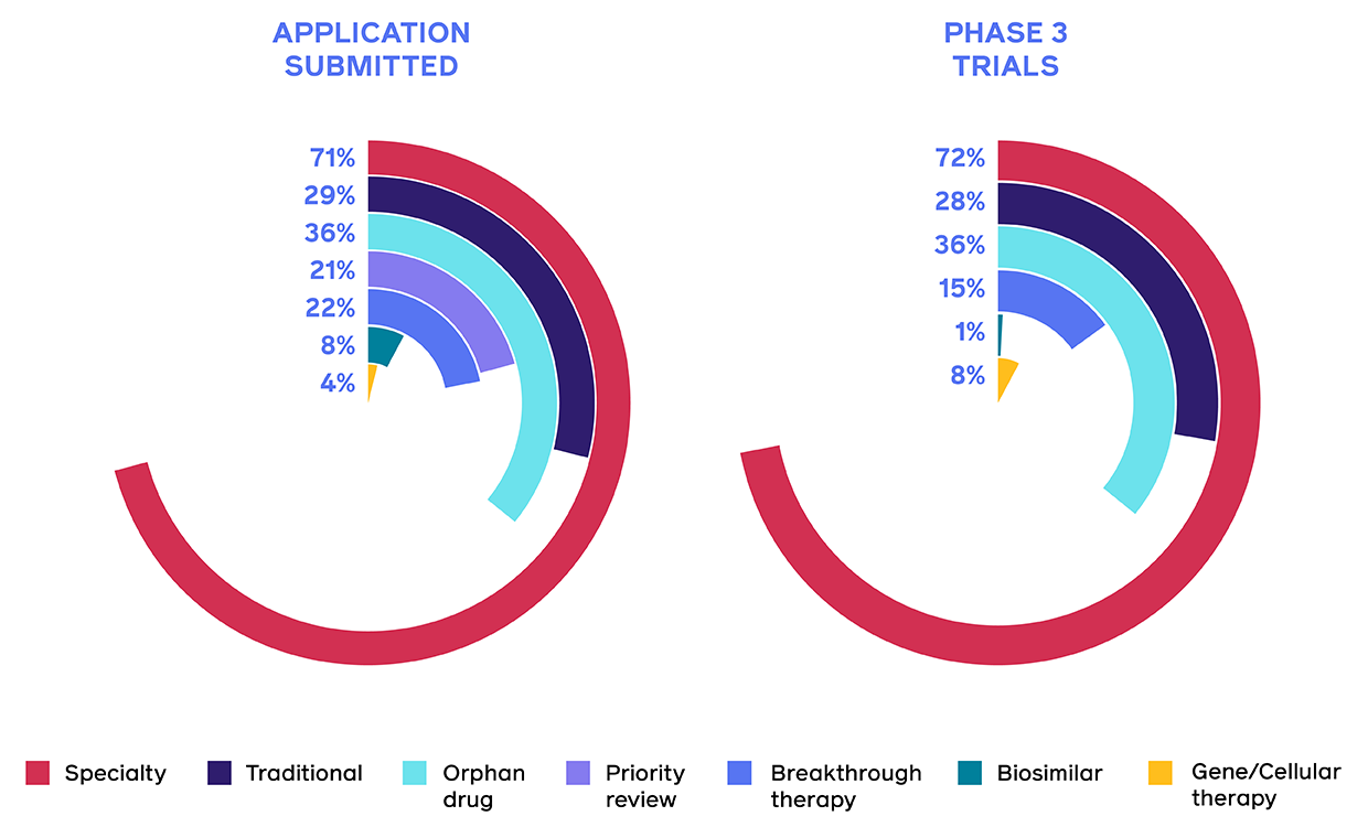 The FDA decisions for specialty medications (71%) and for Orphan Drugs (36%) continue to grow for agents with applications submitted to the FDA. Nine agents are seeking FDA’s Accelerated Approval.