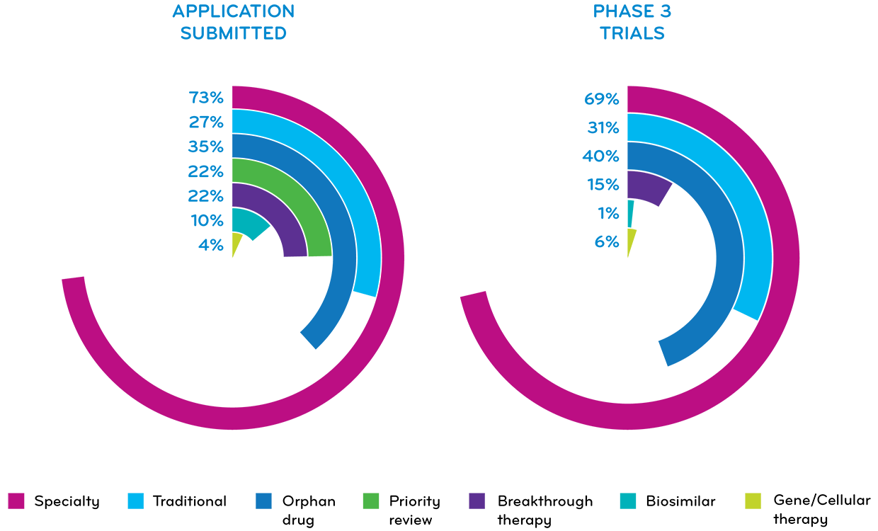 The FDA decisions for specialty medications (73%) and for Orphan Drugs (35%) continue to grow for agents with applications submitted to the FDA. Three agents are seeking FDA’s Accelerated Approval.