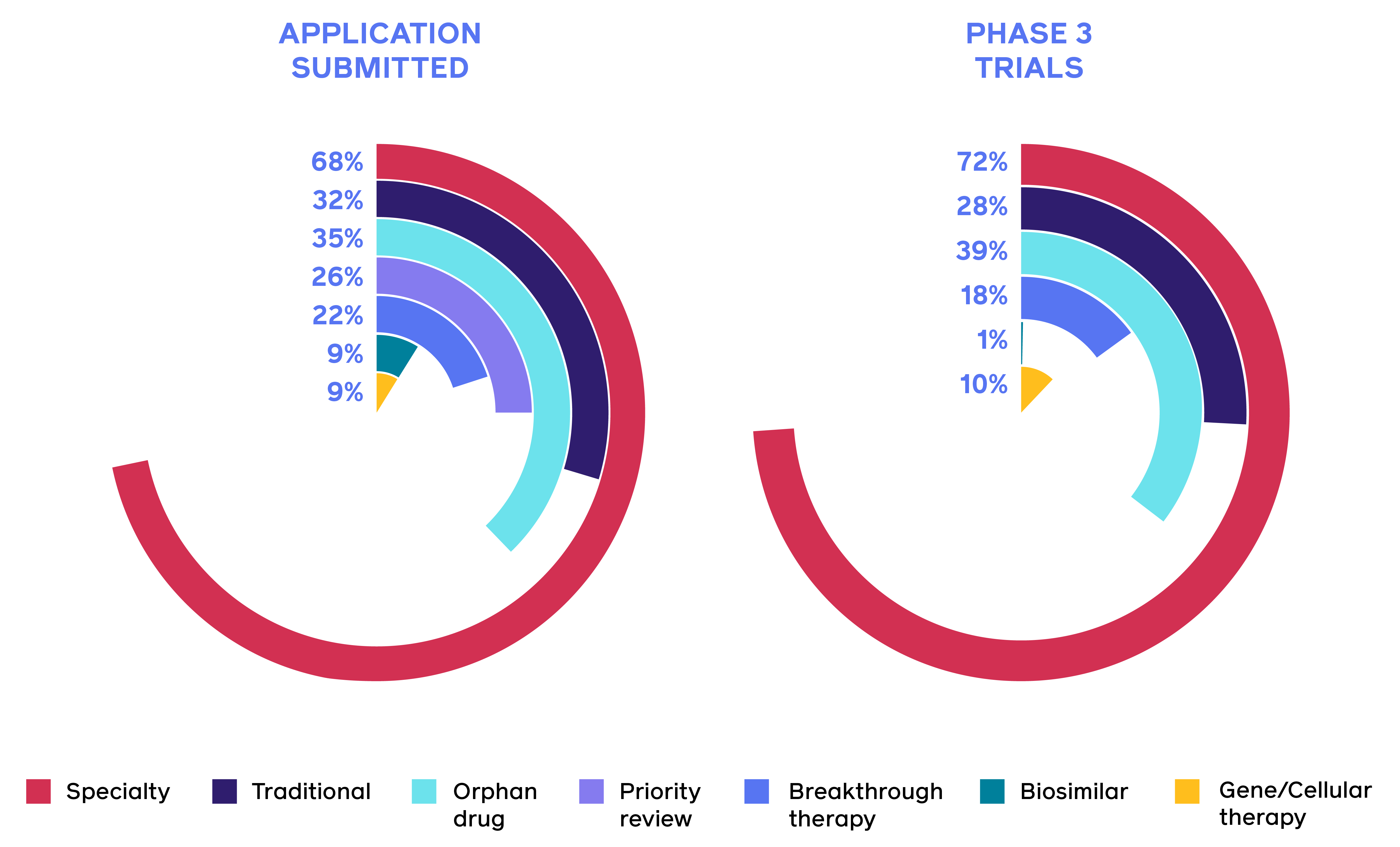 The FDA decisions for specialty medications (68%) and for orphan drugs (35%) continue to grow for agents with applications submitted to the FDA. Five therapies, four of which are for Orphan conditions, are seeking FDA’s Accelerated Approval. FDA’s Accelerated Approval pathway allows for earlier approval of drugs to treat serious conditions, and fill an unmet medical need based on a surrogate endpoint. Confirmatory trials are needed to confirm clinical benefit for these drugs to remain on the market. Among the products submitted to the FDA, two products are voucher recipients under the new Commissioner’s National Priority Voucher (CNPV) pilot as products with significant potential to address a major national priority.
