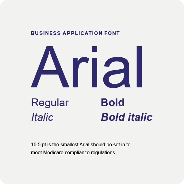 Arial is our common font and should be used (where applicable) when working with the new Prime Therapeutics brand. Please use Arial when using our new logo or referencing our new brand. Our complete guidelines for using typeface and fonts can be accessed within the brand toolkit.